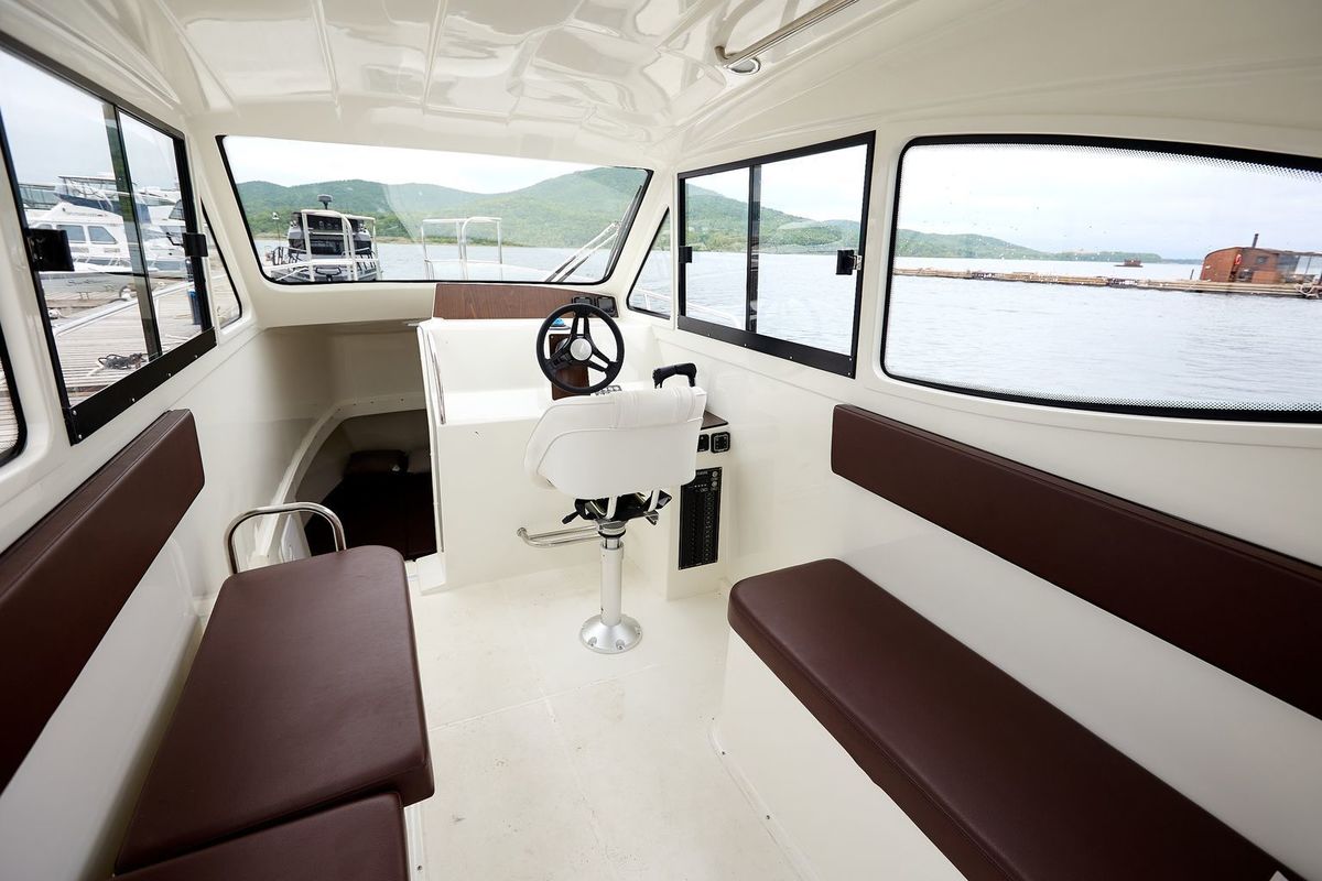 Панорамное остекление закрытой комфортабельной рубки гарантирует превосходную обзорность, позволяя легко ориентироваться и уверенно управлять катером.